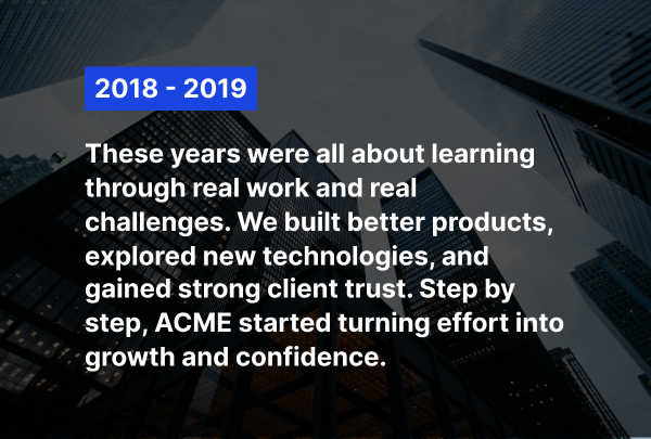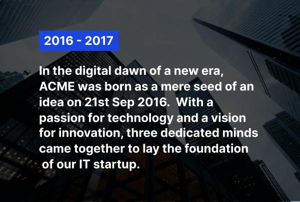 ACME began as a small dream, built with passion, belief, and hard work. In the early days, every challenge taught us something valuable. We learned how to work with people, understand technology, and earn trust. There were moments of doubt, slow days, and tough decisions. But with every fall, we stood up stronger and more confident. This journey is not just about growth, but about moving forward together. Each project helped us improve, not just our skills but our mindset. Our team learned the value of patience, consistency, and clear communication. Client relationships became partnerships built on honesty and results. Today, we continue this journey with the same passion and stronger purpose.